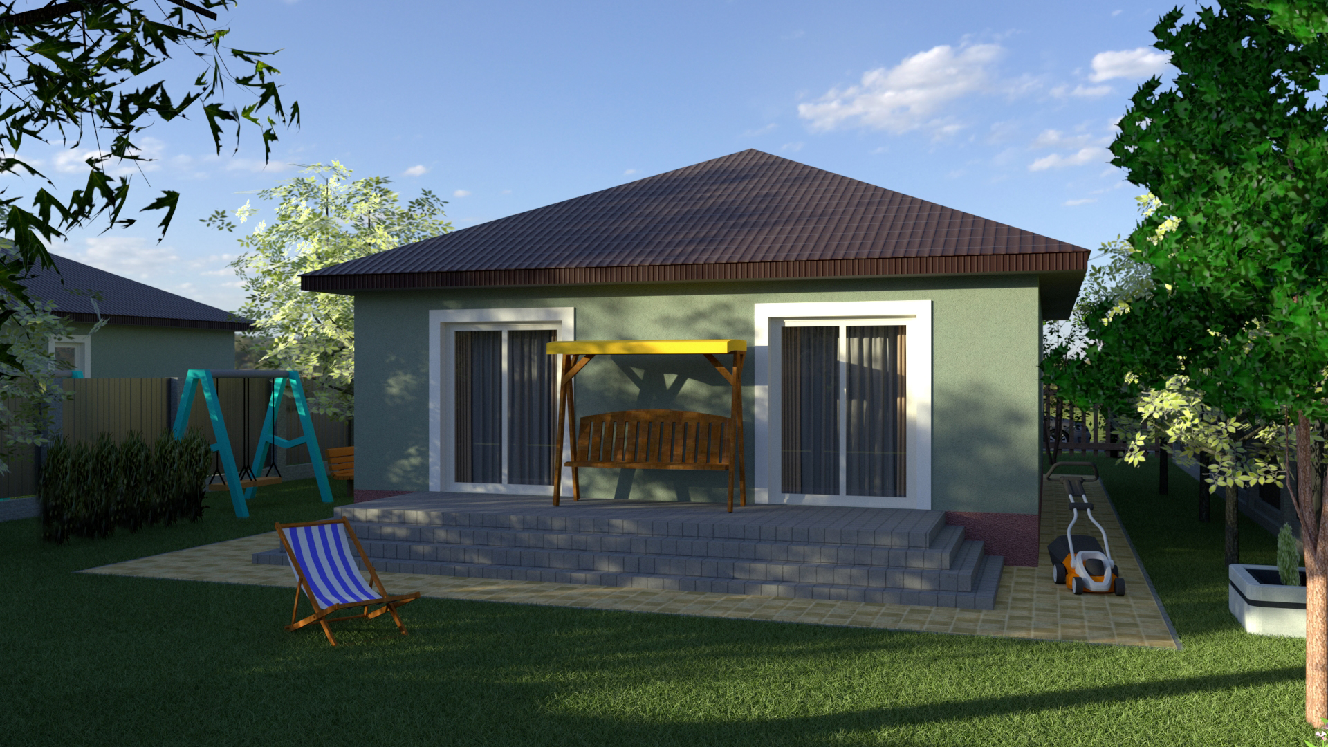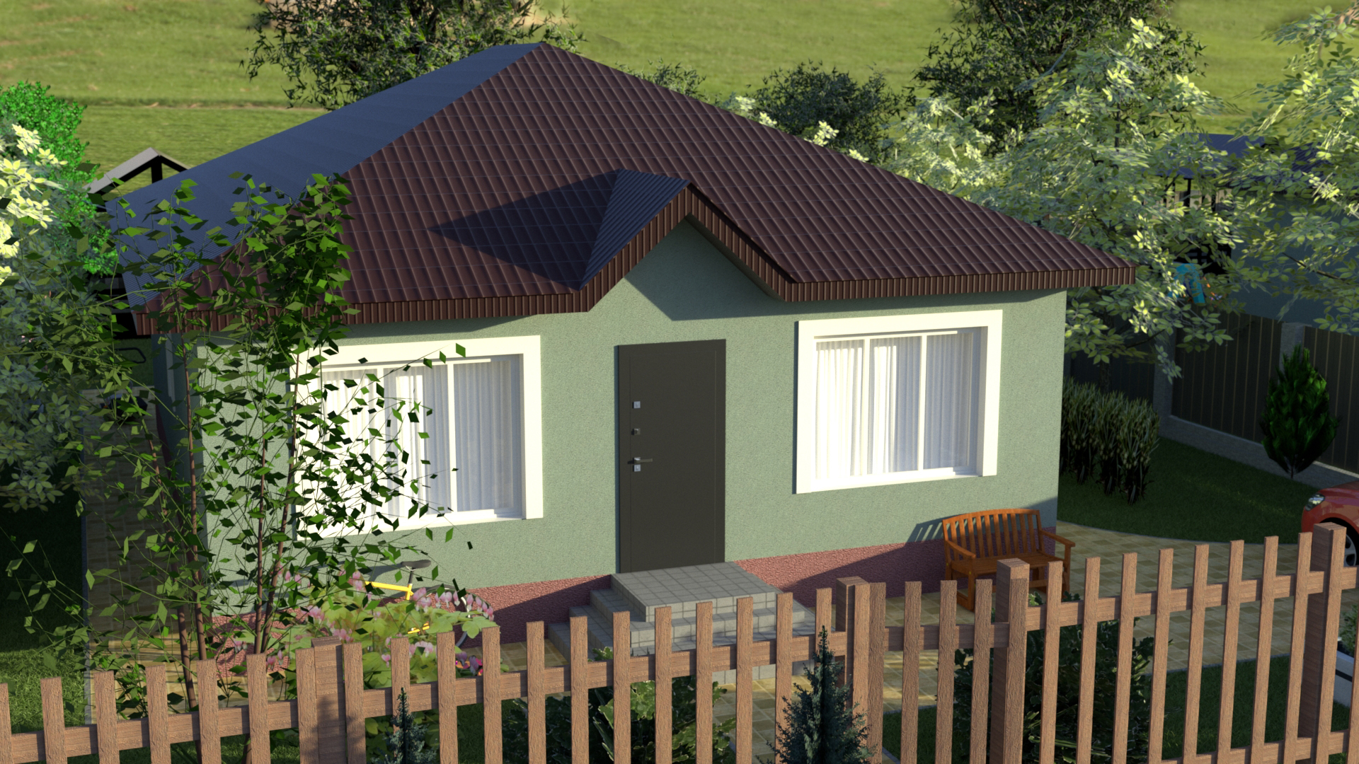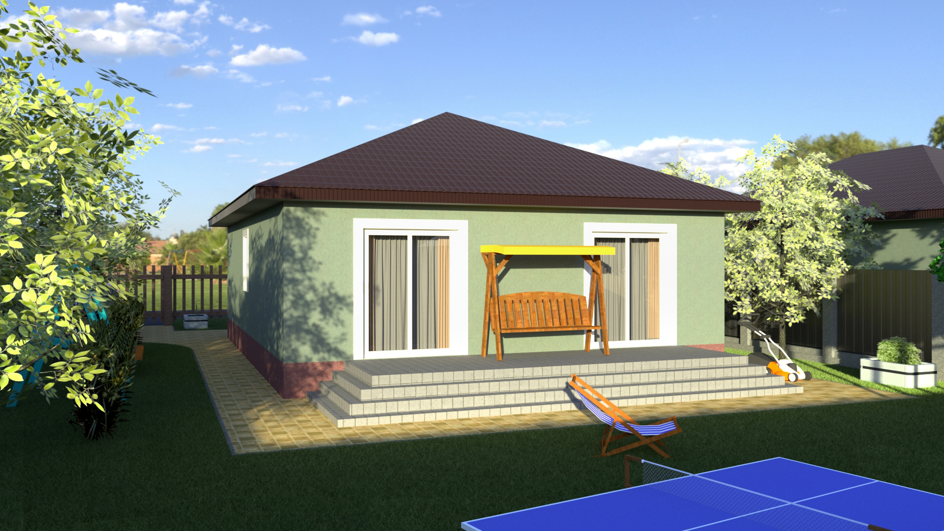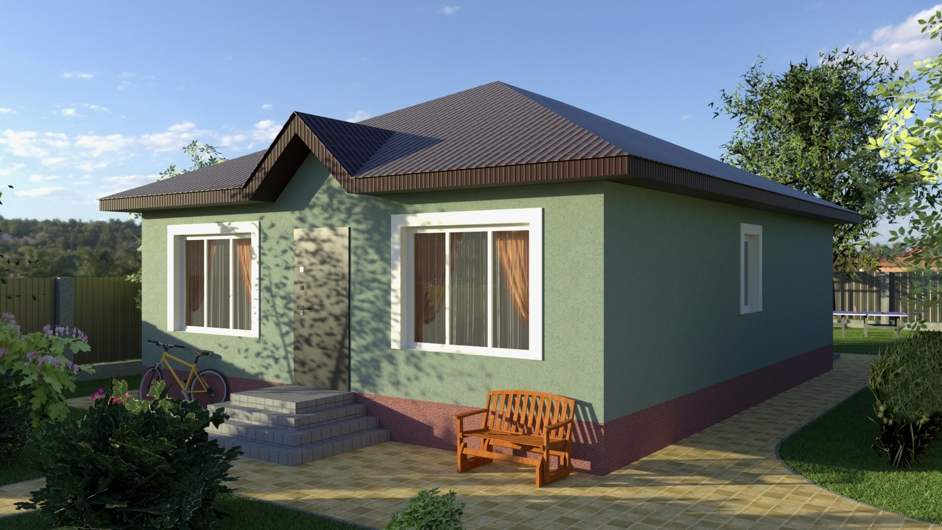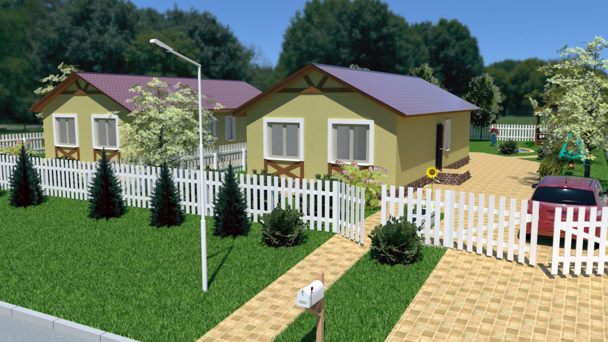 Один из популярных проектов нашей компании. Уютный дом с удобной планировкой. Дом имеет две спальни, два сан.узла, совмещенную кухню-гостинную с выходом на террасу. Большой участок позволяет свободно разместить гараж и другие постройки.